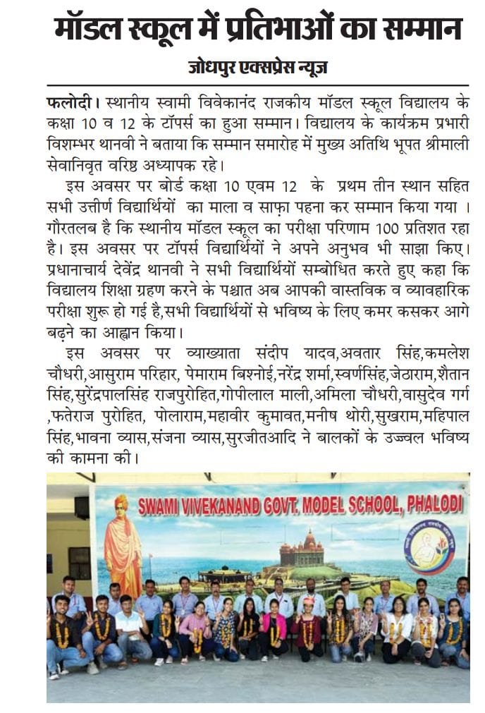 मॉडल स्कूल का परिणाम शत-प्रतिशतस्थानीय स्वामी विवेकानंद राजकीय मॉडल स्कूल,फलोदी का कक्षा 10th व 12th का परीक्षा परिणाम शत प्रतिशत रहा।