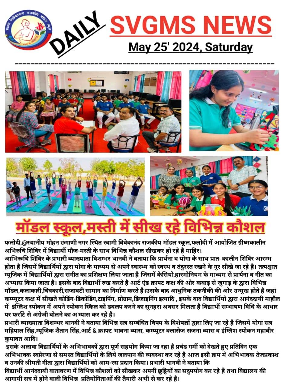 स्वामी विवेकानंद राजकीय मॉडल स्कूल फलोदी से 38 विद्यार्थियों के दल में मयूर चोपासनी स्कूल जोधपुर में आयोजित करियर मेले में भाग लिया । जहां देश के विभिन्न विश्वविद्यालयों द्वारा विभिन्न क्षेत्रों में करियर व कोर्सेज के बारे में जानकारी दी गई । प्रधानाचार्य देवेंद्र थानवी ने बताया कि विद्यालय से गए दल के साथ में सुरेंद्र पाल सिंह राजपुरोहित व कमलेश सिंह चौधरी ने राष्ट्रीय विधि विश्वविद्यालय जोधपुर व फुटवियर डिजाइनिंग एवं डेवलपमेंट संस्थान जोधपुर में विद्यार्थियों को शैक्षणिक भ्रमण करवाया । जहां पर एन एल यू की सहायक प्रोफेसर श्रीमती अंजलि थानवी तथा एफ डी डी आई के सहायक प्रोफेसर सुनील चौहान ने विद्यार्थियों के लिए सेमिनार आयोजित करवाकर विधि व फैशन डिजाइनिंग के क्षेत्र में करियर की विभिन्न संभावनाओं की जानकारी दी । -